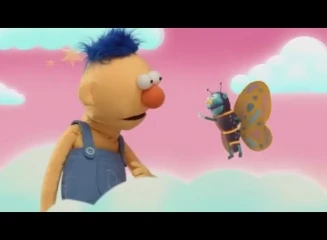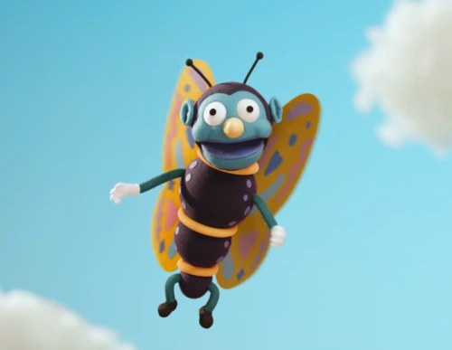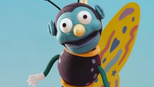 He is a butterfly, with a turquoise face and a blue mouth. He has two black antennae on his head, with balls on the end. He wears three rings and he has polka dots near his arms. He wears black shoes and has yellow wings, which have shapes such as hearts, squiggly lines, stars, rhombus, and circles. He has a red heart on his chest.